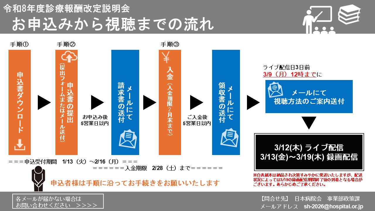 | 8.資料 | 説明資料は3月12日のライブ配信日までに配信画面下部の「資料ダウンロード」に掲載いたしますのでダウンロードしてご覧ください。 参加者1名につき、白表紙本「点数表改正点の解説(医科・調剤)」を1冊お送りいたします(DPC関連は含みません)。 ※白表紙本は納品され次第すみやかに発送いたしますが、3月12日のライブ配信日よりも遅れての到着となることをご承知おきください。配送状況によっては3月19日の録画配信期間終了後のご到着となる場合がございます。あらかじめご了承ください。 ※なお、白表紙本のみの販売はいたしません。 DPC関連の資料、その他の販売については、日本病院共済会(03-3264-9888)にお問い合わせください。 |