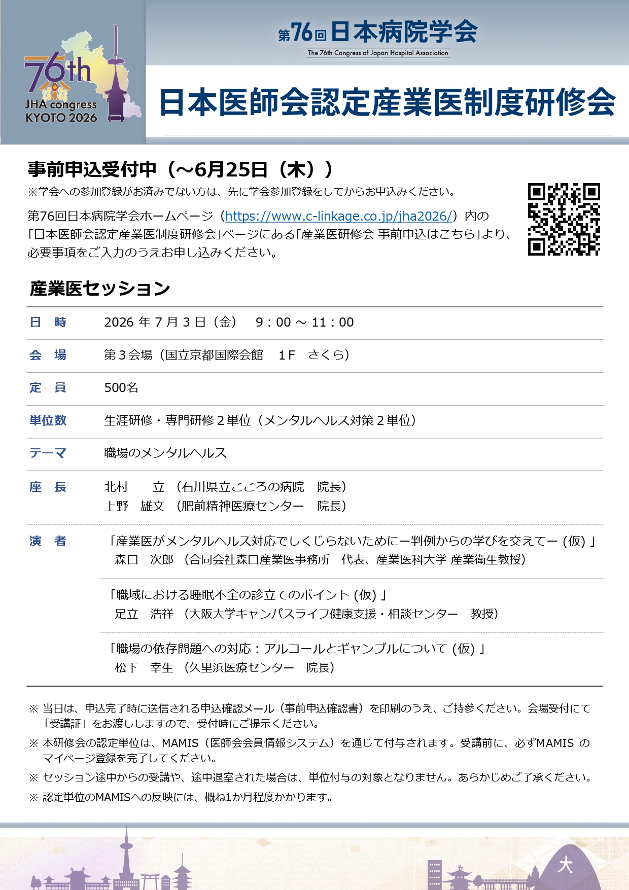 日本病院会では、第76回日本病院学会(国立京都国際会館)において、産業医研修会を開催いたします。